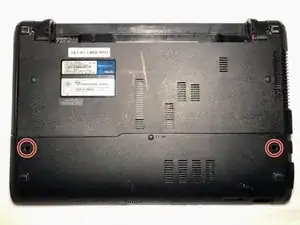 Переверните ноутбук так, чтобы нижняя часть была обращена вверх, и найдите два переключателя по бокам от аккумулятора.