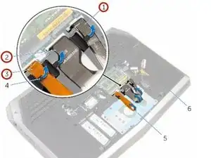 Обратите внимание на прокладку кабеля жесткого диска и снимите кабель с направляющих на основании компьютера.
