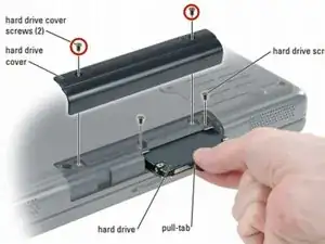 Переверните компьютер и удалите винты крышки жесткого диска, крышку и винты жесткого диска.