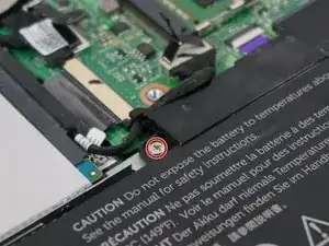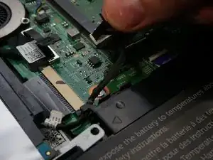 Используя зажим на соединителе кабеля, отключите кабель подключения жесткого диска и удалите его из кабельного канала на аккумуляторе.