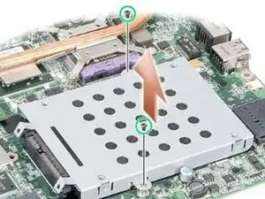 Удалите два винта, крепящие сборку жесткого диска к материнской плате.