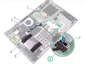 Приклейте ленту, фиксирующую кабель жесткого диска к области подставки для ладоней и клавиатуре.