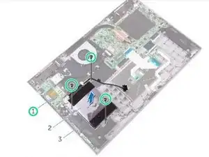 Вкрутите три винта (M2x3), которые крепят узел жесткого диска к области подставки для ладоней и клавиатуре.