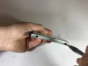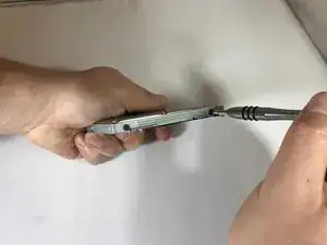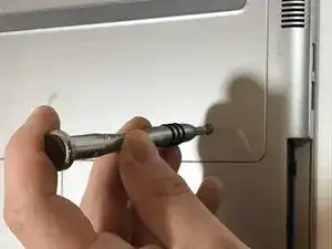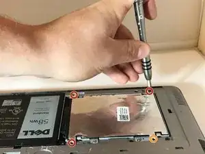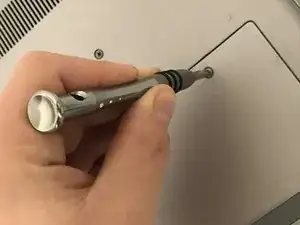 Выверните серебряный винт PH1 длиной 15 мм, который фиксирует пластиковую крышку над аккумулятором.