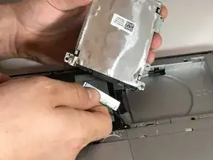 Аккуратно покачивайте и тяните разъём, чтобы отключить ленточный кабель, соединяющий жесткий диск с ноутбуком.