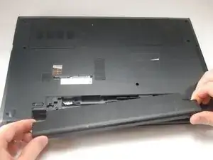 Переверните компьютер на нижнюю сторону и сдвиньте зажимы с обеих сторон аккумулятора наружу.