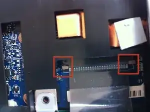 Удалите аккумулятор из ноутбука, нажав на две вкладки снаружи и потянув аккумулятор наружу. Вкладки выделены синим цветом. Уберите аккумулятор в сторону.