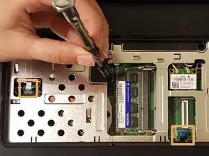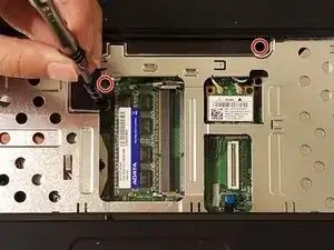 Удалите два винта 3 мм, удерживающие жесткий диск, на нижней стороне ноутбука отверткой Phillips #PH00.