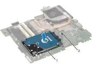 Закрепите два винта, которые фиксируют сборку жесткого диска к системной плате.