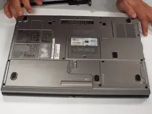 Переверните ноутбук и найдите замок слайда батареи. Передвиньте переключатель и осторожно поднимите батарею.