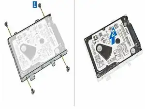 Удалите винты, фиксирующие кронштейн жесткого диска к жесткому диску [1], и извлеките жесткий диск из кронштейна жесткого диска [2].