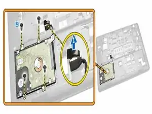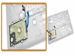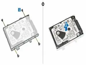 Удалите винты, крепящие сборку жесткого диска к компьютеру [2].