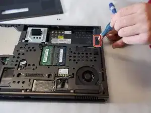 С помощью отвертки #00 извлеките винт 1,5 мм, затем сдвиньте, чтобы разблокировать держатель SSD.