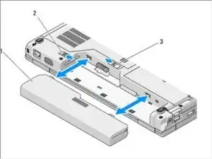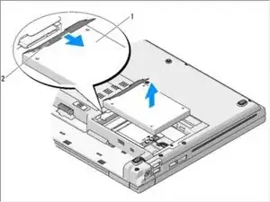 Переведите рычаг фиксатора батареи в открытое положение. (Возможно, потребуется удерживать рычаг в открытом положении при извлечении батареи.) {3}