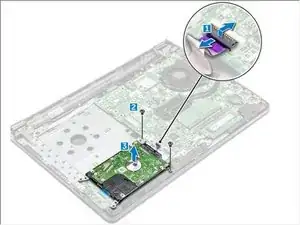 Удалите винты, которые крепят сборку жесткого диска к компьютеру [2].