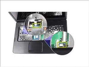 Переверните компьютер и отключите кабель платы питания (1) и кабель тачпада (2).