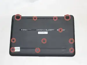 Снимите выделенные винты, крепящие корпус ноутбука, используя отвертку Phillips №00.
