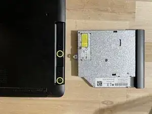 После того, как вы уберете винт дискового привода (синий круг), привод должен выдвинуться из корпуса.