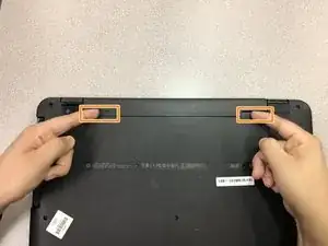 Нажмите на петли, сжимая их внутрь, которые расположены в верхней части ноутбука.