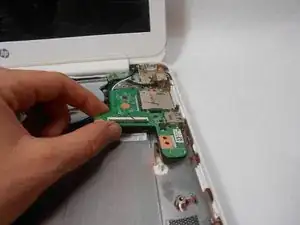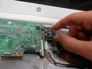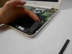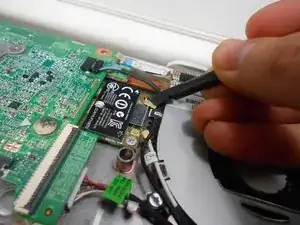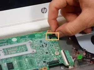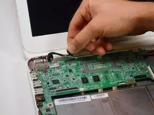 С помощью лопатки отсоедините белый и чёрный кабели от платы.