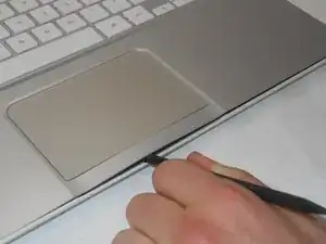Начиная с верхнего правого угла ноутбука, двигайтесь по часовой стрелке, используя инструмент iFixit или лопатку, чтобы отсоединить клавиатуру от корпуса ноутбука.