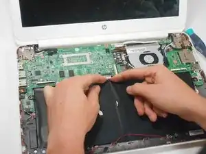 Используйте пальцы, чтобы вытащить белую планку из чёрного разъёма над батареей.