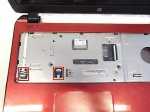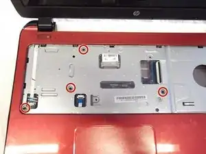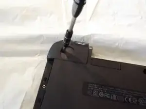 Удалите винт Phillips #1 длиной 4 мм, расположенный примерно в середине ноутбука, немного справа, рядом со значком дисковода.