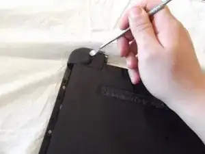 С помощью лопатки (spudger) снимите резиновые уплотнители, расположенные в верхнем левом и верхнем правом углах ноутбука.