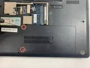 Используйте отвертку Phillips #0, чтобы снять два винта, крепящих панель жесткого диска на задней стороне ноутбука.