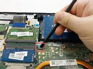 Потяните синюю петлю вверх и вытащите её из материнской платы, чтобы отсоединить ленточный кабель.