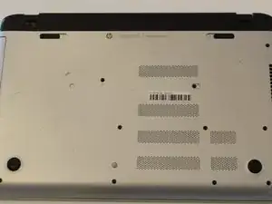 Поместите ноутбук на ровную поверхность дном вверх. Логотип HP должен смотреть вниз.