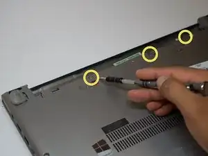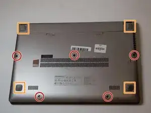 Отодвиньте резиновые зажимы из углов задней стороны ноутбука, чтобы открыть доступ к винтам.