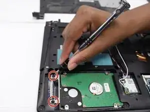 Используя отвертку Phillips #0, удалите два винта диаметром 3 мм на конце крепления жесткого диска.