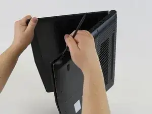 Переверните ноутбук на бок и используйте лопатку или кредитную карту, чтобы поддеть нижнюю крышку. Чтобы лучше зафиксировать, вы можете слегка открыть ноутбук.