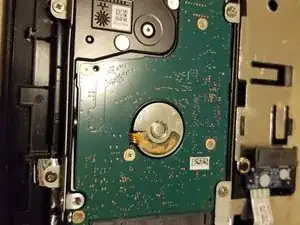 Удалите винт, который находится под двумя винтами клавиатуры, и вытащите дисковод.