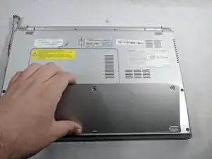 Аккуратно возьмитесь за края ноутбука и переверните его, чтобы открыть заднюю панель.