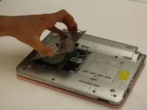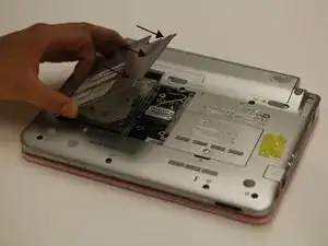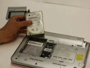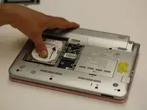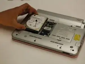 Сняв крышку, с умеренным усилием сдвиньте жесткий диск в сторону верхней части нетбука.