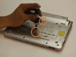 Чтобы получить доступ к жесткому диску, используйте отвертку с битой Torx №0, чтобы отвинтить два указанных винта.