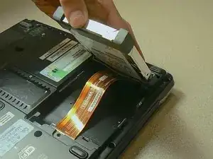 Удалите батарею, отодвинув ее от ноутбука.