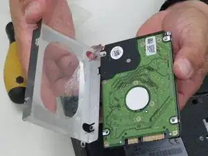 Удерживая пластиковую вставку, аккуратно потяните ее немного вверх и влево, чтобы снять корпус жесткого диска с устройства.