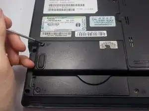 Удерживая захваты, потяните батарею к себе и от ноутбука.