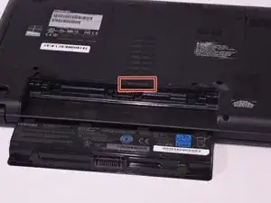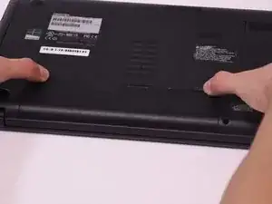 Используя два пальца, потяните ребристые зажимы на нижней стороне компьютера к краям. Это разблокирует батарею.