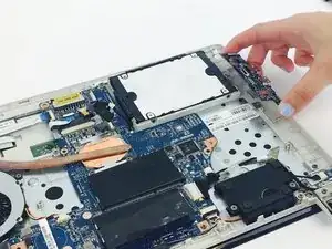 С помощью лопатки нажмите на белые язычки рядом с аккумулятором, пока не услышите щелчок.