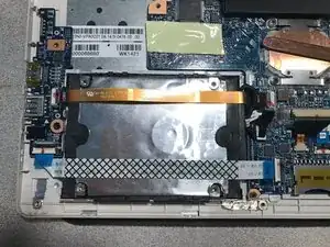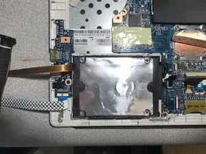 Жесткий диск находится в правом переднем углу ноутбука. Поскольку устройство перевернуто, диск должен быть в левом переднем углу.