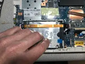 Необходимо отсоединить два шлейфа и убрать их в сторону, чтобы получить доступ к жесткому диску. Вы можете использовать пластиковую лопатку из предыдущих шагов, чтобы поднять черные и белые пластиковые защелки, а затем аккуратно вынуть шлейф из соединителей, как показано на последних двух фотографиях.