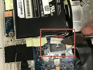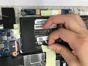 Удалите желтую ленту, соединяющую аккумулятор с остальной частью ноутбука, просто потянув за ней.