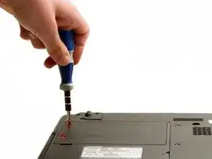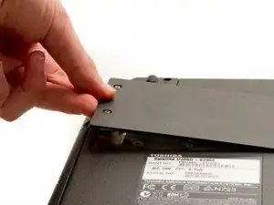Положите ноутбук на его бок и открутите два винта #1 с крестообразной головкой на задней стороне черной пластиковой панели с приподнятым центром.