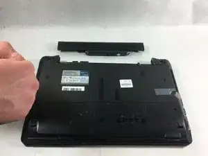 Переместите другой ползунок с левой стороны аккумулятора влево, и другой рукой вытяните аккумулятор из ноутбука.