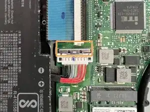С помощью ногтя или лопатки отведите назад фиксирующую защелку, удерживающую разъем батареи.