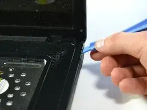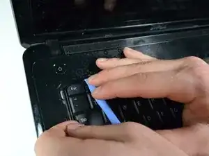 Одной рукой прижмите левую защелку вниз пластиковым инструментом для открытия (над клавишей F1). Другой рукой приподнимите левую сторону клавиатуры.